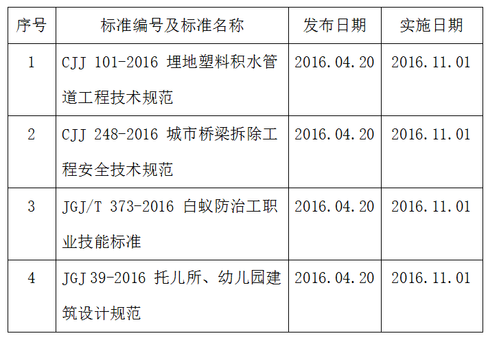 2016年11月開始實施的工程建設標準