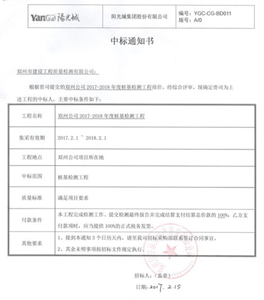 我司榮幸成為陽光城鄭州公司開展樁基檢測工作的首選企業(yè),并達(dá)成長期戰(zhàn)略合作。經(jīng)過初期輾轉(zhuǎn),資料整合,部門陳總帶領(lǐng)項(xiàng)目負(fù)責(zé)人王偉東與對方進(jìn)行五次約談,順利中標(biāo)。