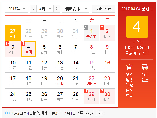 2016年4月2日至4日放假調(diào)休,共三天。4月1日(星期六)上班。