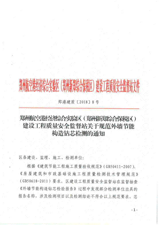 鄭州航空港經(jīng)濟(jì)綜合實驗區(qū)(鄭州新鄭綜合保稅區(qū))建設(shè)工程質(zhì)量安全監(jiān)督站關(guān)于規(guī)范外墻節(jié)能構(gòu)造鉆芯檢測的通知