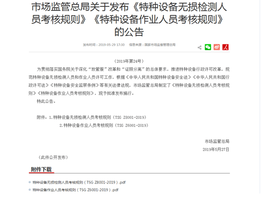為貫徹落實國務院關于深化“放管服”改革和“證照分離”的總體要求,推進特種設備行政許可改革,規(guī)范特種設備無損檢測人員和作業(yè)人員許可工作,根據(jù)《中華人民共和國特種設備安全法》《中華人民共和國行政許可法》《特種設備安全監(jiān)察條例》等有關法律法規(guī),市場監(jiān)管總局制定了《特種設備無損檢測人員考核規(guī)則》《特種設備作業(yè)人員考核規(guī)則》,現(xiàn)予批準發(fā)布施行。
