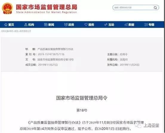 第五十六條 本辦法自2020年1月1日起施行。2010年12月29日原國家質(zhì)量監(jiān)督檢驗檢疫總局令第133號公布的《產(chǎn)品質(zhì)量監(jiān)督抽查管理辦法》、2014年2月14日原國家工商行政管理總局令第61號公布的《流通領(lǐng)域商品質(zhì)量抽查檢驗辦法》、2016年3月17日原國家工商行政管理總局令第85號公布的《流通領(lǐng)域商品質(zhì)量監(jiān)督管理辦法》同時廢止。