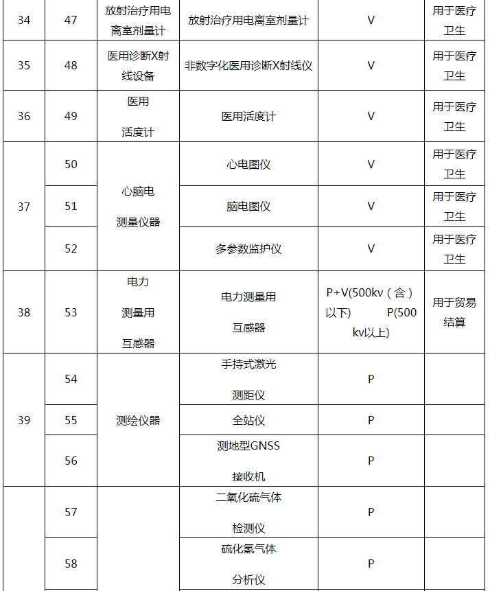 1 | 1 | 體溫計(jì) | 體溫計(jì) | P+V(其中玻璃體溫計(jì)只做型式批準(zhǔn)和首次強(qiáng)制檢定,失準(zhǔn)報(bào)廢) | 用于醫(yī)療衛(wèi)生 |