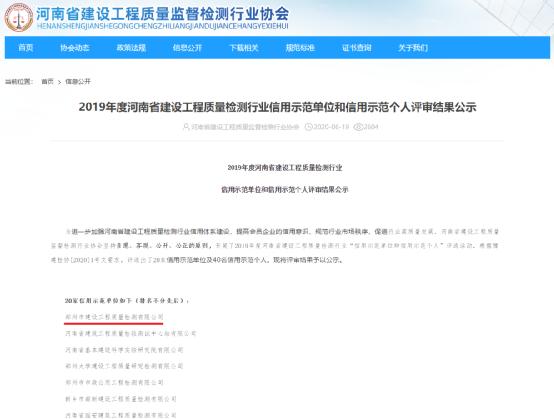 喜訊!我司榮獲2019年河南省建設(shè)工程質(zhì)量檢測行業(yè)信用示范單位