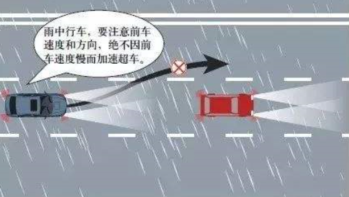 雨天視線受阻,一定要隨時(shí)注意前車的行駛速度和方向,絕不可因前車速度慢而加速超車。雨天輪胎與地面的摩擦力大大減小,如果加速超車的話,很容易造成輪胎側(cè)滑,造成交通事故。