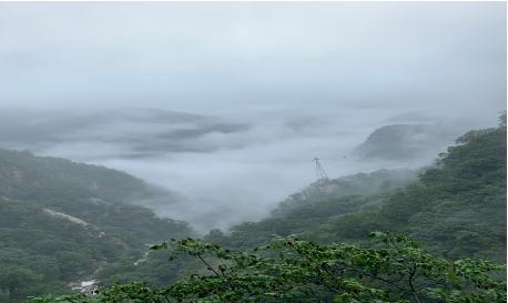 此次旅程一開始就充滿了緊張刺激,蜿蜒的山路盤旋而上,坐在上山的大巴車上宛如坐過(guò)山車。一路上群山環(huán)繞,既是“蒨首見龍游,群山翠浪流”,也是冷疊群山闊,清涵萬(wàn)象殊。