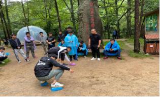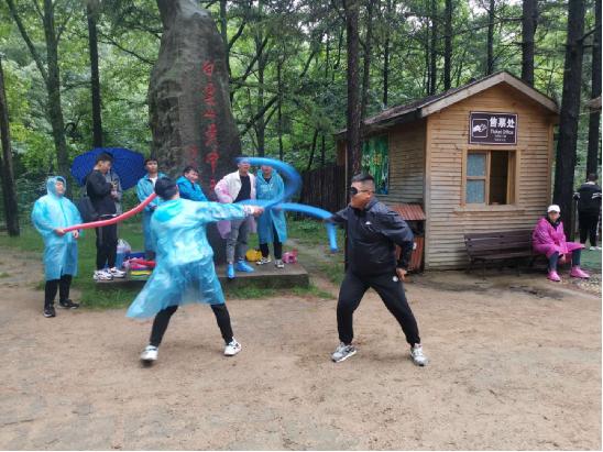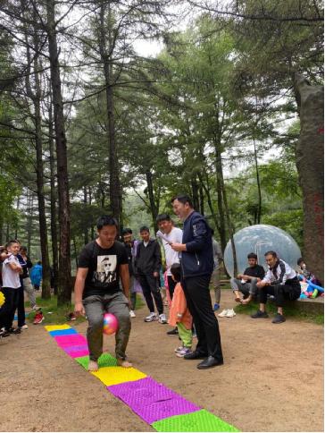 第二站到達(dá)的是森林氧吧。這是以森林、清泉、山石、溪澗、瀑布為基點(diǎn),以高含量的對(duì)人體健康極為有益的森林空氣負(fù)氧離子和植物精氣等生態(tài)因子為特色,輔以各類簡(jiǎn)約、樸素且與環(huán)境格調(diào)相一致的游憩設(shè)施。于是就在這里做起了團(tuán)建活動(dòng)。本著友誼第一,比賽第二,消除隔閡、提高團(tuán)隊(duì)協(xié)作能力提高凝聚力的宗旨,開展了“帶球大沖關(guān)”、“摸石頭過(guò)河”、“蒙眼互打”三項(xiàng)競(jìng)技活動(dòng)。