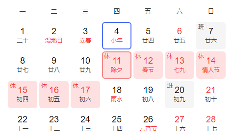 2月11日至17日放假調(diào)休,共7天。2月7日(星期日)、2月20日(星期六)上班。