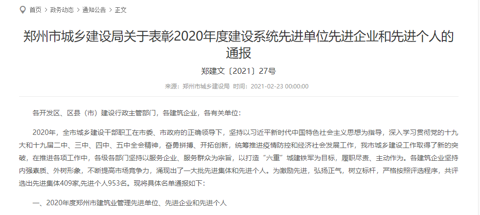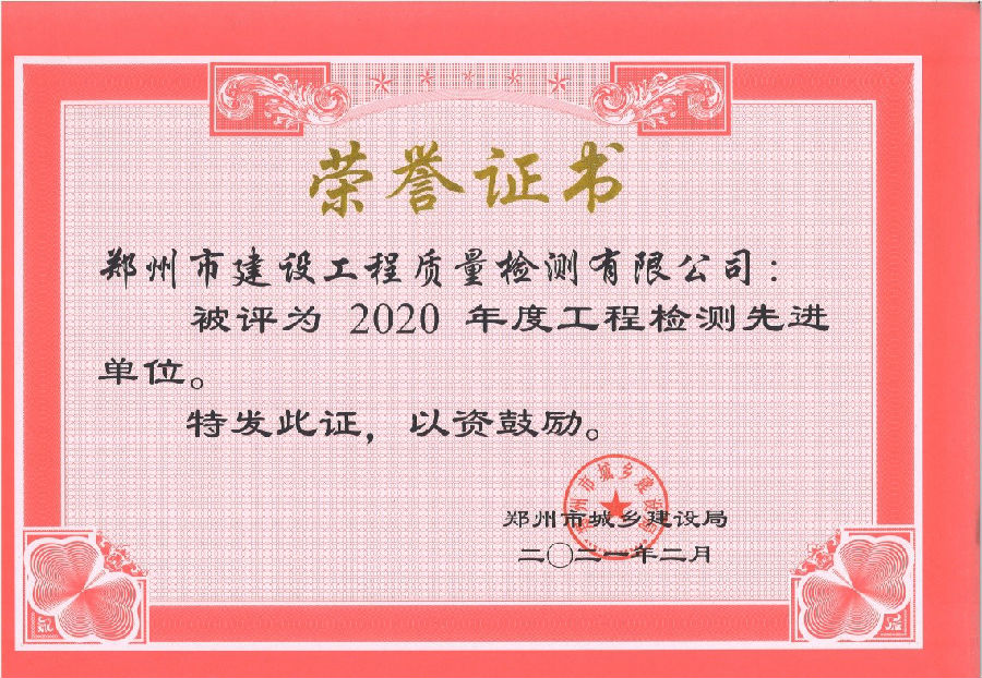 2021年2月23日,根據(jù)鄭州市城鄉(xiāng)建設(shè)局公布的“關(guān)于表彰2020年度建設(shè)系統(tǒng)先進(jìn)單位先進(jìn)企業(yè)及先進(jìn)個人的通報(bào)(鄭建文〔2021〕27號),我公司被評為“2020年度工程檢測先進(jìn)單位”,這無疑為我們今年的高速發(fā)展打了一劑強(qiáng)心針。